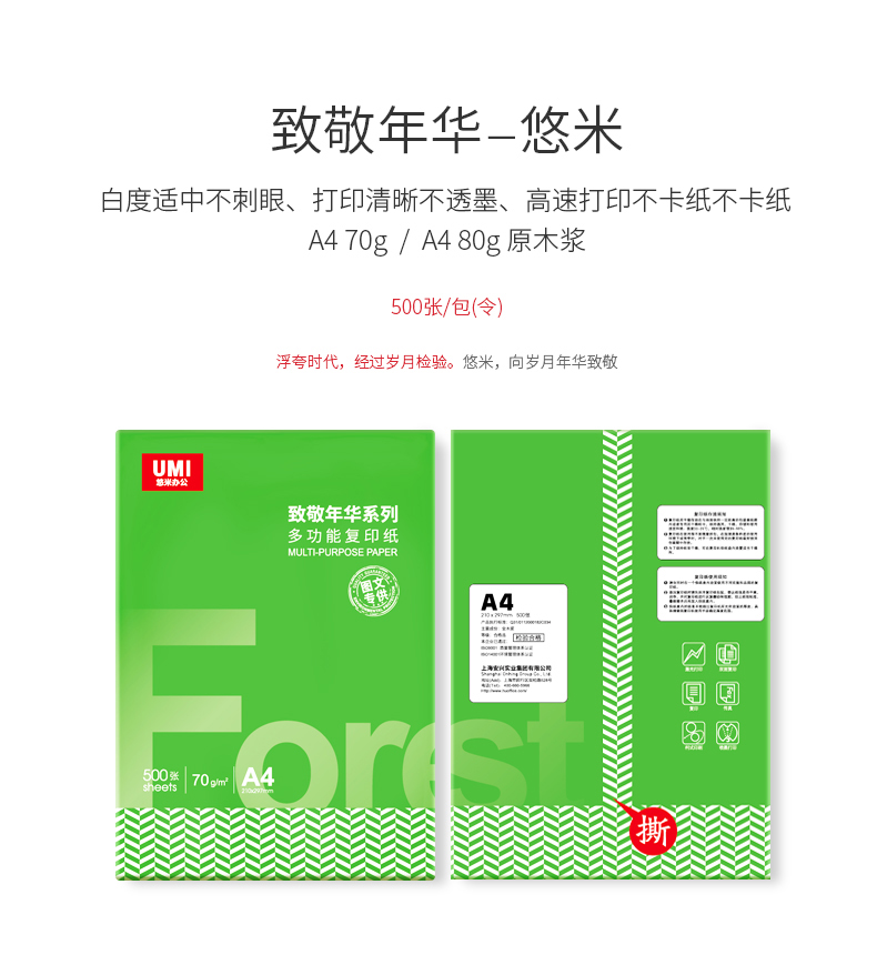 悠米 致敬年华复印纸 70G A4 500张 5令/箱