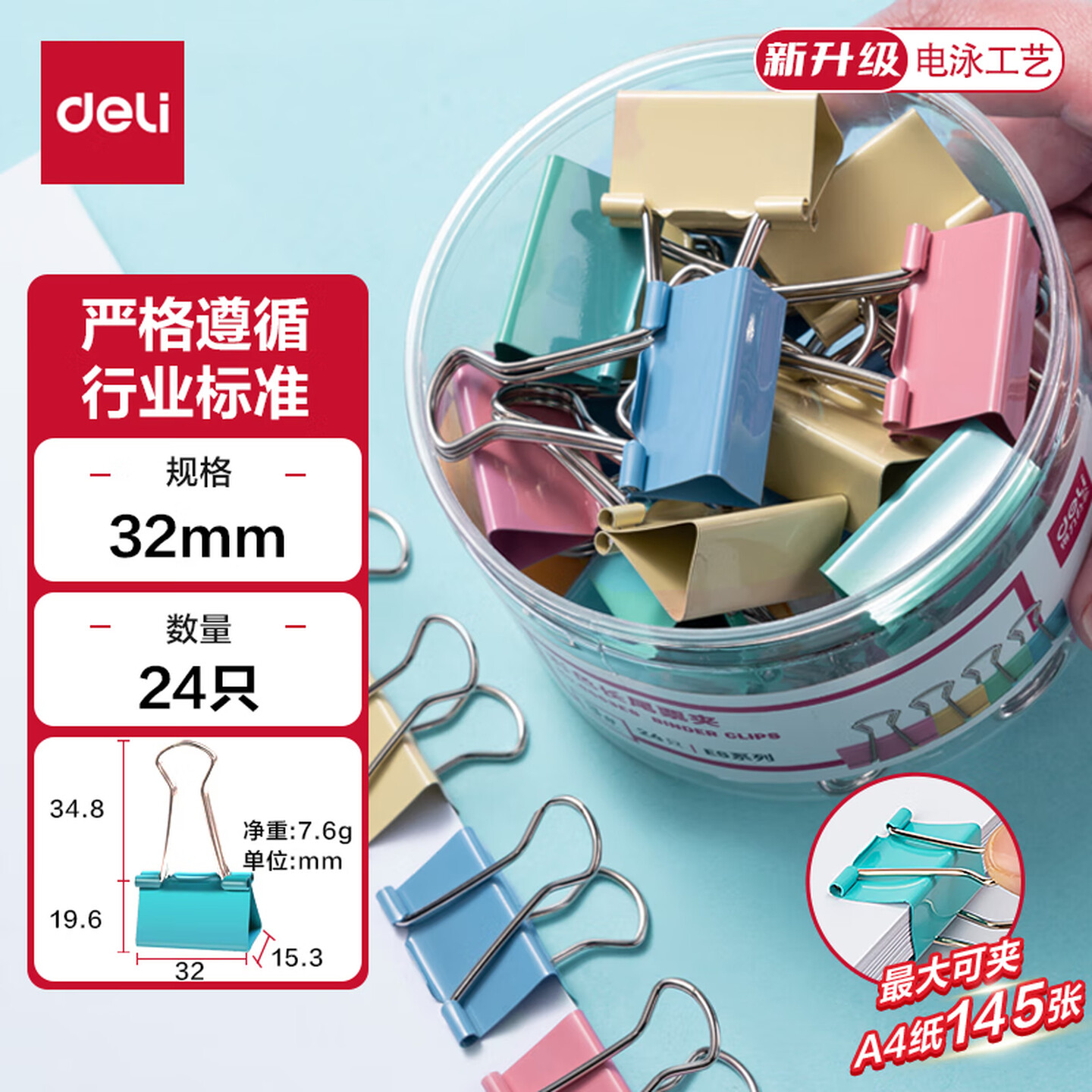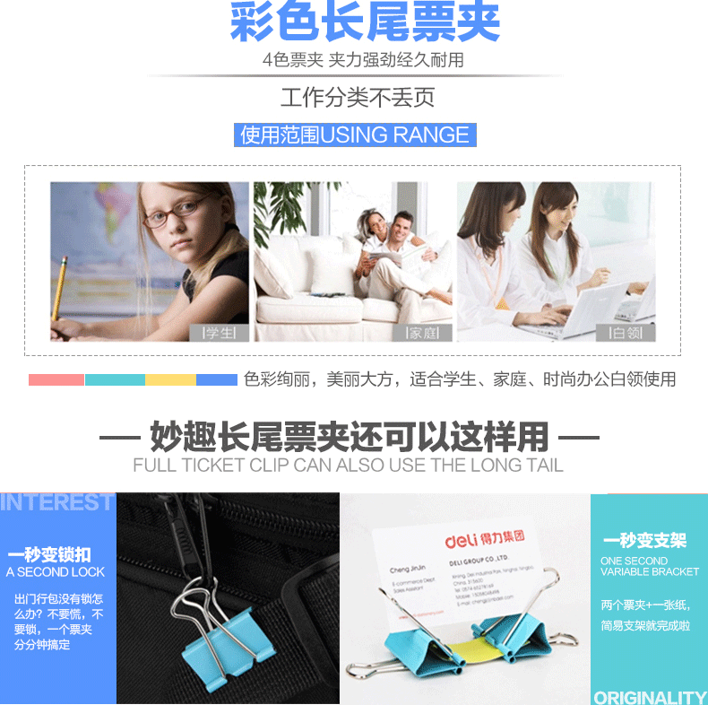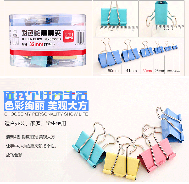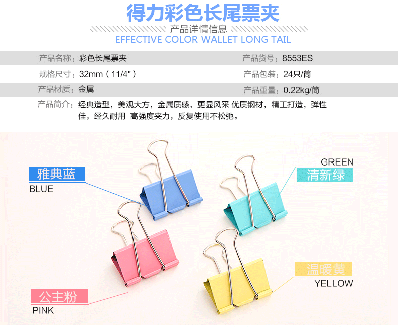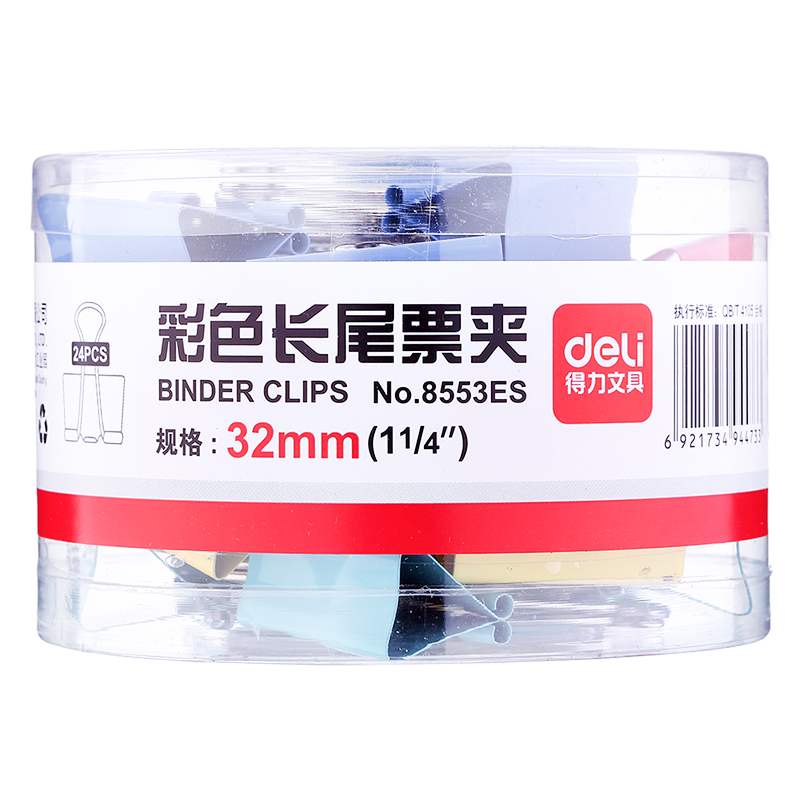 得力(deli)8553ES(混)3#彩色长尾票夹(筒装